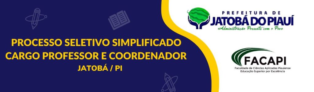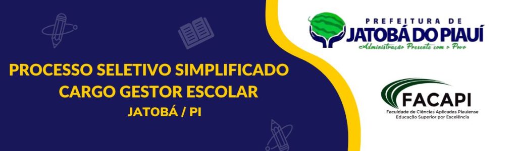 PROCESSO SELETIVO SIMPLIFICADO 2026CARGO GESTOR ESCOLARJATOBÁ – PI O MUNICÍPIO DE JATOBÁ DO PIAUÍ, Estado do Piauí, pessoa jurídica de direito público interno, inscrito no CNPJ sob o nº 01.612.557/0001-46, com sede nesta cidade, no Estado do Piauí, localizada à Praça Nossa Senhora da Graças, nº S/N, Centro, Jatobá – PI, no uso de suas […]